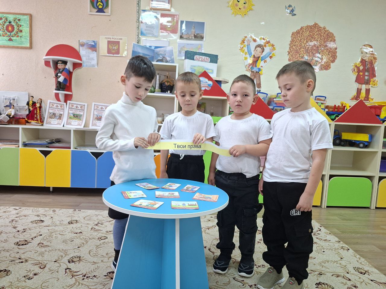 В МДОУ «Майском детском саду «Солнышко» в старшей разновозрастной группе с крымскотатарским языком обучения «Фиданчыкъ» в рамках программы «Истоковедения» для дошкольников «Разговоры о главном» прошло занятие, посвященное Дню Конституции. Занятие было направлено на формирование у детей представлений о Конституции РФ, гражданских правах и обязанностях, воспитание патриотических чувств, чувства любви к родной стране и уважения к своему народу, а также формирование ценностного понятия «Родина».